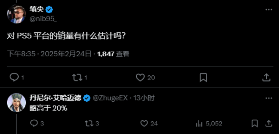 不过也有玩家好奇这份总销量在各个平台的分布如何,对此游戏市场调研公司Niko Partners 的总监 Daniel Ahmad 回复表示,他们预测的PS5销量份额占比略高于20%,也就是说大约有560万份来自于PS5平台。