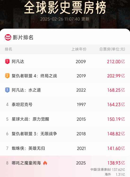 《哪吒2》中国(含港澳台)及海外总票房突破了138亿元,暂居全球影史票房榜第八,即将超过居第七的《蜘蛛侠:英雄无归》。