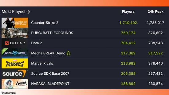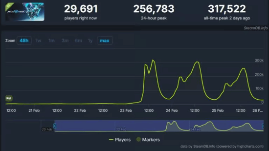西山居最新机甲题材力作《解限机》最新Demo测试“全球风暴”于2月23日开启,据SteamDB数据,测试当天游戏Steam平台的在线人数峰值达到了317522人,这是一个十分惊人的成绩,短短几小时便跻身Steam在线玩家榜的第五名,一度超越了《GTA5》、《漫威争锋》和《Apex》等诸多热门游戏。