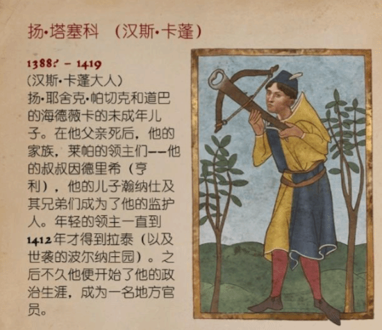 在本作中,玩家控制的主角亨利是可以选择与汉斯·卡彭亲热的,而“少主”汉斯的原型,是被称作皮尔克施泰因的扬·塔塞科。根据图鉴资料显示,他出生于1388年左右,而《天国:拯救2》的时代是设定在1403年,也就是说这时的汉斯只有15岁。这一发现让游戏招来了不少的谩骂。