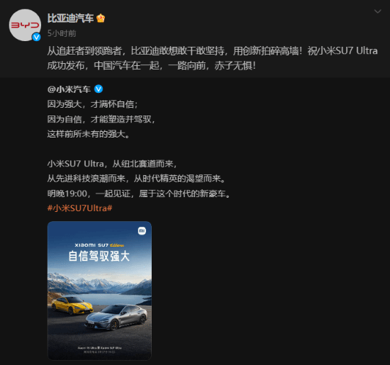 比亚迪官博发文:“从追赶者到领跑者,比亚迪敢想敢干敢坚持,用创新拍碎高墙!祝小米SU7 Ultra成功发布,中国汽车在一起,一路向前,赤子无惧!”