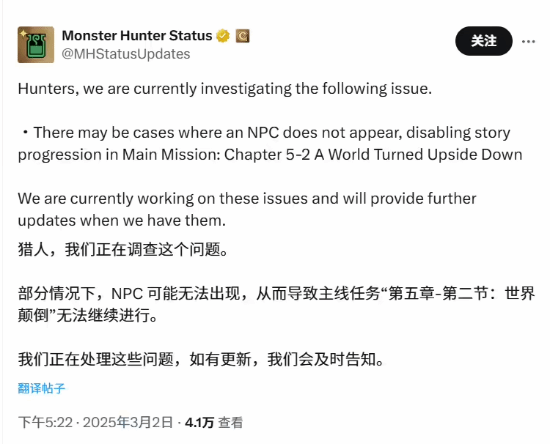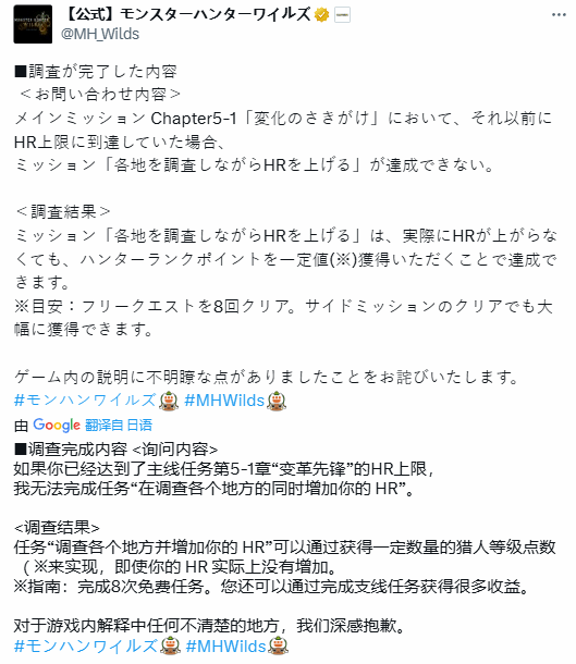 后续官方还提到,如果玩家在到达主线“5-1”章节时,猎人等级(HR)已达到了上限,将无法完成任务“调查地区并提高您的HR”导致卡关。对此官方表示,即使HR没有显示提升,但仍可以通过完成自由任务或支线任务来推进进度,大约需要8个任务就可以完成这一章节。