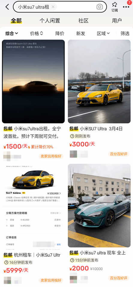 当前已有首批消费者购买了小米SU7 Ultra,在二手交易平台里可以看到,部分消费者开始将自己的小米SU7 Ultra对外出租,价格不等,有消费者开出了3000元一天的价格。