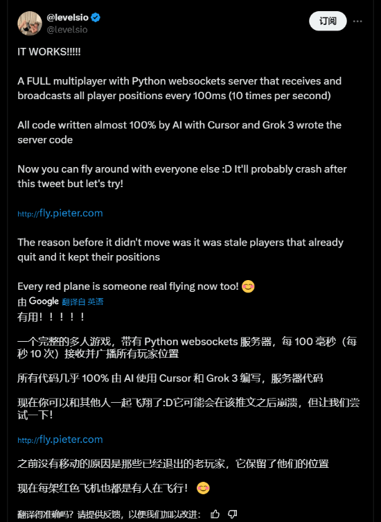 近日推特上一名玩家自制了一款飞行模拟游戏。这款游戏最特殊的地方在于,它的代码几乎全都是由AI编写的,其中Cursor编写了大部分代码,而Grok 3则负责服务器端代码!