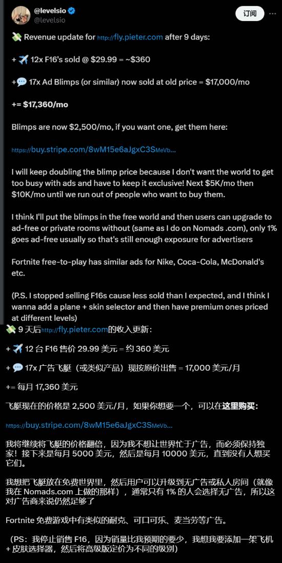 据他介绍,该游戏发布9天后,他已经赚到了17360美元,换算成人民币高达12.65万元。据悉,他主要是靠在游戏中的“广告飞艇”上投放广告来获利,此外还会卖一些付费飞机。