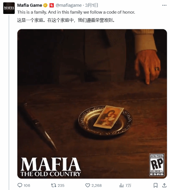 在去年的TGA 2024里,2K与Hangar 13工作室放出了《四海兄弟:故乡》的首部预告片,游戏将于今年夏季发售。日前,《四海兄弟:故乡》官推再次发文预热,说道:“这是一个家庭。在这个家庭里,我们遵守荣誉准则。”