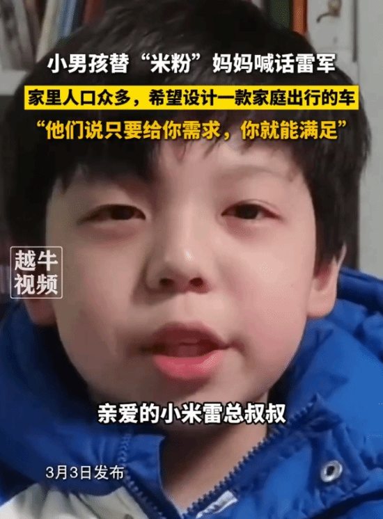 3月3日,一小男孩发视频替自己的“米粉”妈妈喊话雷军:“亲爱的小米雷总叔叔,我们也很很想成为你品牌新车的第一批车主,可是我们家人口众多,基本出行都需要满足六人。你能不能设计一款能满足我们全家人一起出行的车?我们也想成为小米车主。”