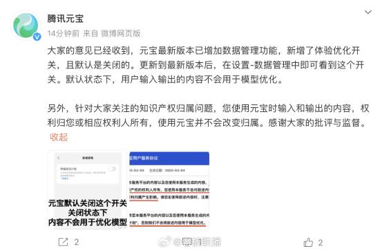 3月5日,针对腾讯元宝服务协议争议一事,腾讯元宝官方称大家的意见已经收到,元宝最新版本已增加数据管理功能,新增了体验优化开关,且默认是关闭的。更新到最新版本后,在设置-数据管理中即可看到这个开关。默认状态下,用户输入输出的内容不会用于模型优化。