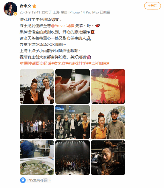 者来女:“(在)游戏科学年会现场终于见到儒雅至尊的冯骥先森~呀~黑神话悟空的戒指收到、开心的原地爆炸,请老天爷善待置心一处又耐心做事的人,弄堂小馄饨汤汤水水哦豁~上海下点子小雨散步回酒店也哦豁~ 祝所有主创大家都吉祥如意、美好如初。”