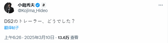 小岛秀夫本人也是随后在X上发文询问玩家们的感受:“您觉得《死亡搁浅2》的预告片如何?”