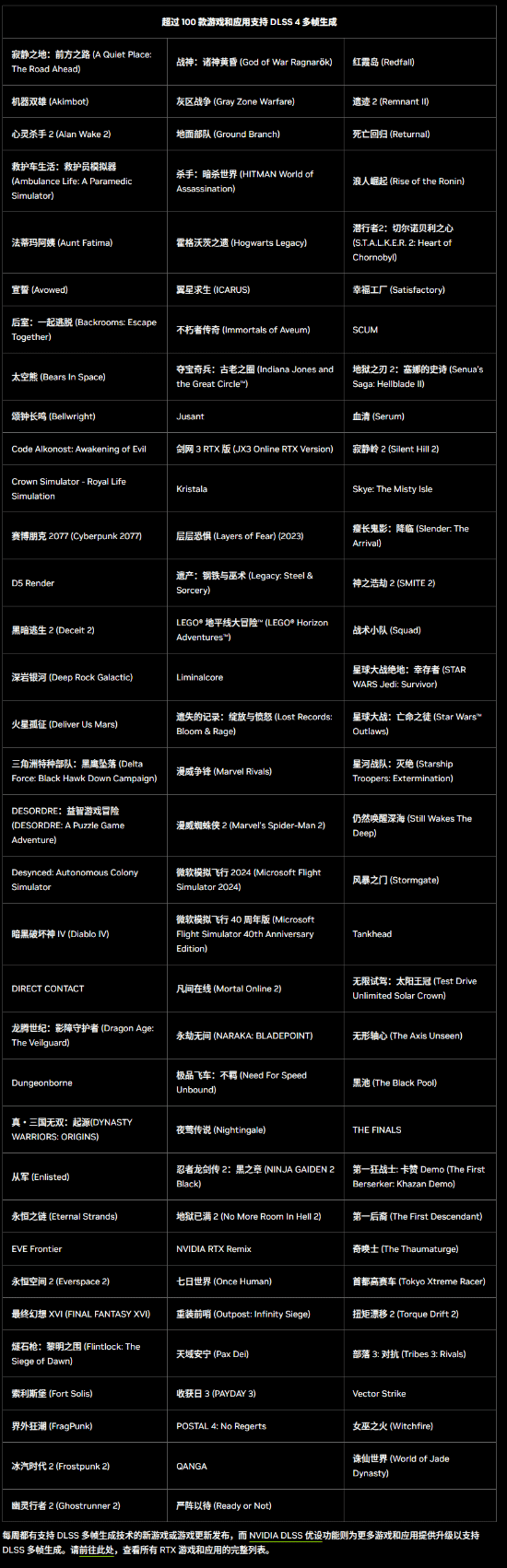 DLSS 4 多帧生成技术可为每个传统渲染帧生成多达三帧,搭配整套 DLSS 技术,最高可将帧率提升至传统图像渲染的 8 倍。可在 GeForce RTX 50 系列显卡和笔记本电脑上实现性能大幅提升,让玩家能够在更高的分辨率下更大限度发挥视觉效果,并以惊人的帧率畅玩游戏。据目前英伟达官方消息,已有超过 100 款游戏和应用现已支持 DLSS 4 多帧生成技术。