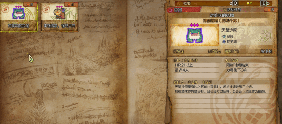 另外一个活动任务则需要狩猎“雌火龙”,狩猎成功后会获得特殊材料来制作头部装备“调查队的耳饰α”。该任务持续至4月2日上午7点59分,需要HR9以上才能进入。