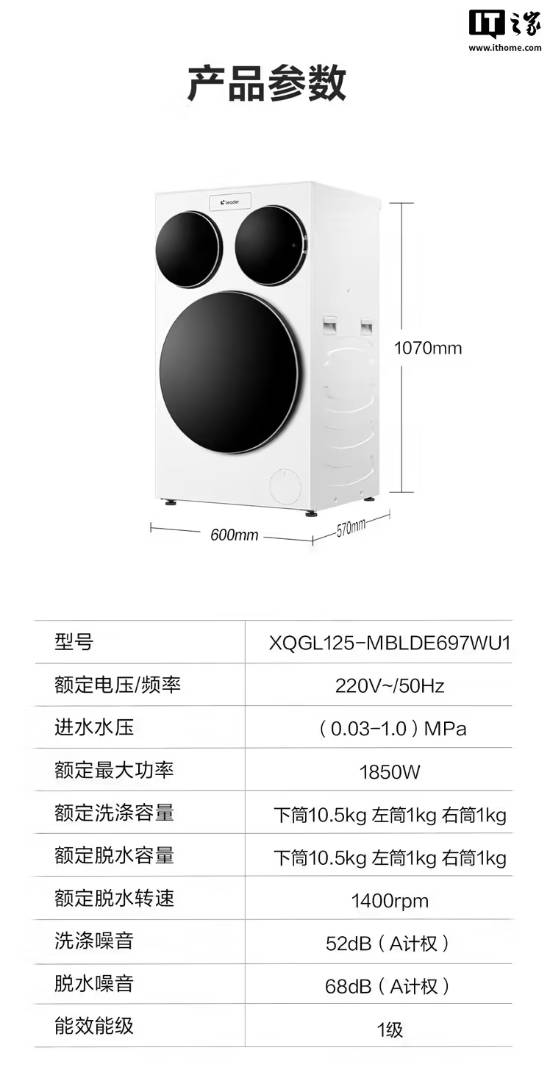 其他方面,相应副筒直径216mm,可容纳1Kg衣物,主筒的直径暂未公布,IT之家附产品规格如下: