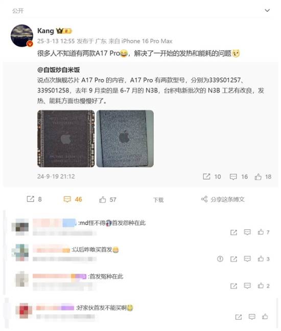 博主白饭炒白米饭介绍,苹果A17 Pro事实上有两个版本,分别是339S01257、339S01258,去年9月苹果卖的是6-7月的N3B,台积电新批次的N3B工艺有改良,解决了一开始网友曝出的发热和能耗问题。这条微博引发热议,不少首发用户表示“自己太冤”,还有网友说“往后首发不敢买了”。