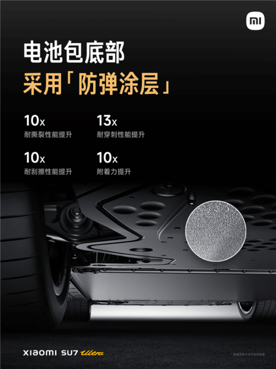 据了解,小米SU7 Ultra的电池包底部就采用了这种“防弹涂层”,可以有效的防止在托底等事故中、因异物冲击、剐蹭造成的电芯损伤。