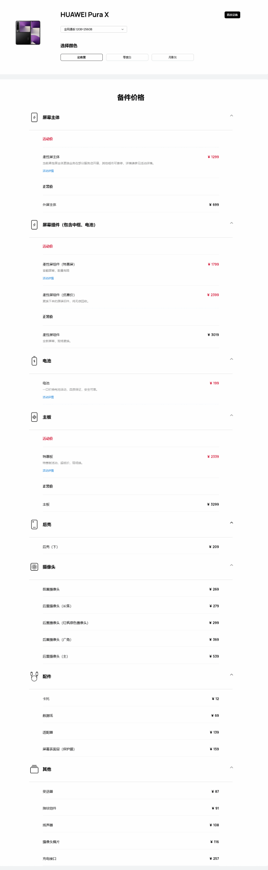 据了解,华为Pura X柔性屏主体价格为1299元,外屏主体价格699元。屏幕组件(包含中框、电池)目前有三种方案可选,价格不同,其中,3019元更换全新柔性屏组件。