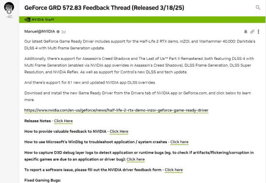 值得关注的是,新版驱动公告特别提到"GeForce RTX 50系列GPU黑屏崩溃问题已得到修复......再次",这意味着针对更多黑屏故障的修复方案正在推出。