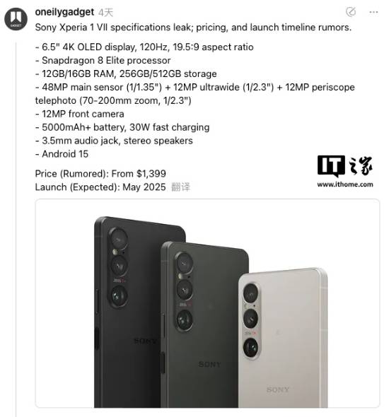 4K 120Hz+骁龙8 Elite!索尼Xperia 1 VII规格泄露:约1万元