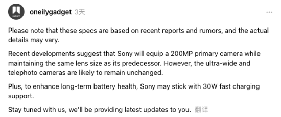 后续Oneilygadget称,他的发文基于最近的报道和预测,实际规格可能有所不同;他还表示,索尼也有可能将主摄升级为2亿像素,但镜头尺寸与上一代相同,但超广角和长焦规格可能保持不变,在快充功率方面,索尼为长期的电池健康考虑,可能持续使用30W的快充规格。