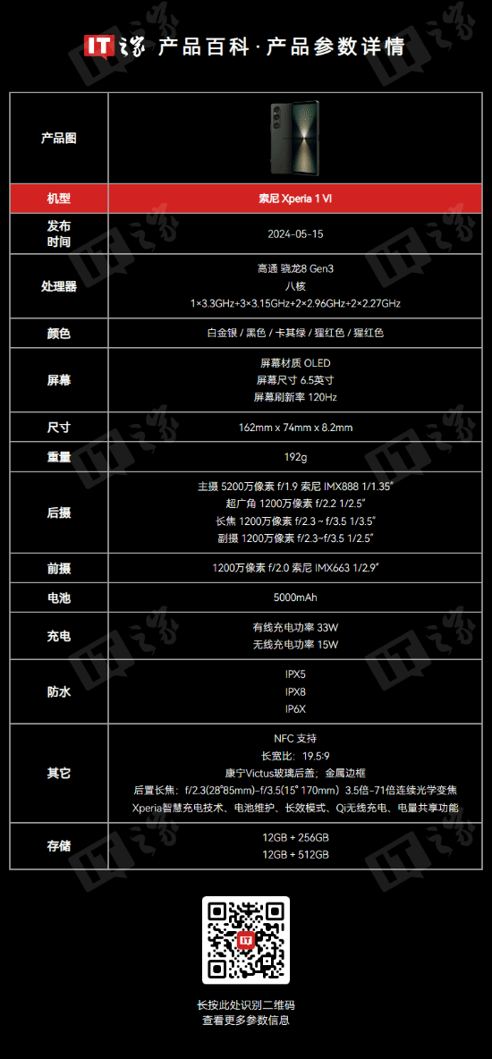 IT之家注:索尼Xperia 1系列在Xperia 1 VI以前均采用4K屏幕,但在Xperia 1 VI上索尼摒弃了4K屏幕,改为2340*1080分辨率的19.5:9屏幕。