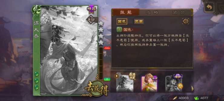 核心技能“国色”成为真正的乐不思蜀,回合四个方块换四个乐不思蜀。且不论什么对局,什么场合,你就说四个乐不思蜀你害不害怕!虽然大家平时都说兵乐废牌,但不代表大家就不怕?被饿死要多难受有多难受!同时,该版本的国色还可以贴乐取消。贴乐取消,起到制衡的作用。取消一次就能二选一摸一张牌,这让她的单挑能力得到增强。并不弱!