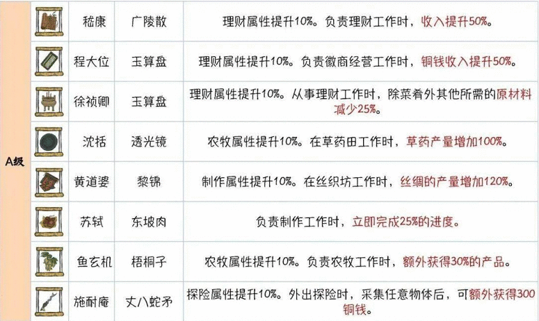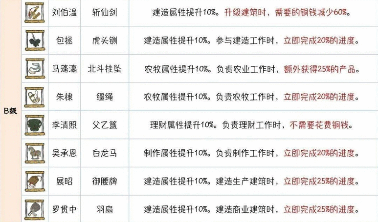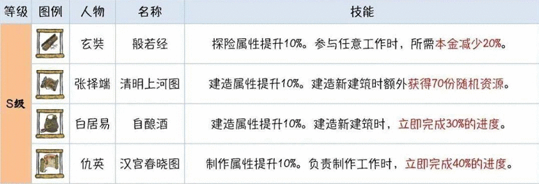 3、其他没提及的-1工人,减铜钱,减少和获得菜肴,加速体力恢复,固定制作生产场所导致非常局限,也是那句话,优先级不高,其实真正强的也就S级的专属。