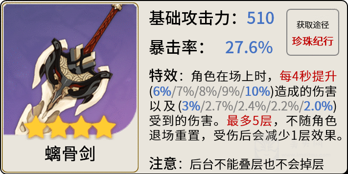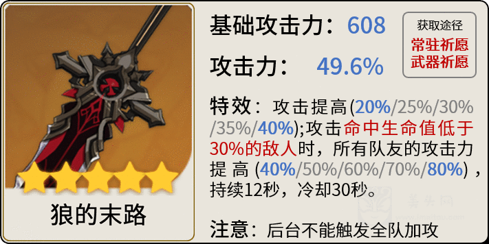 提供攻击力加成和额外攻击力,在五星武器中算是比较容易获得的,歪到这个武器的话也可以用。