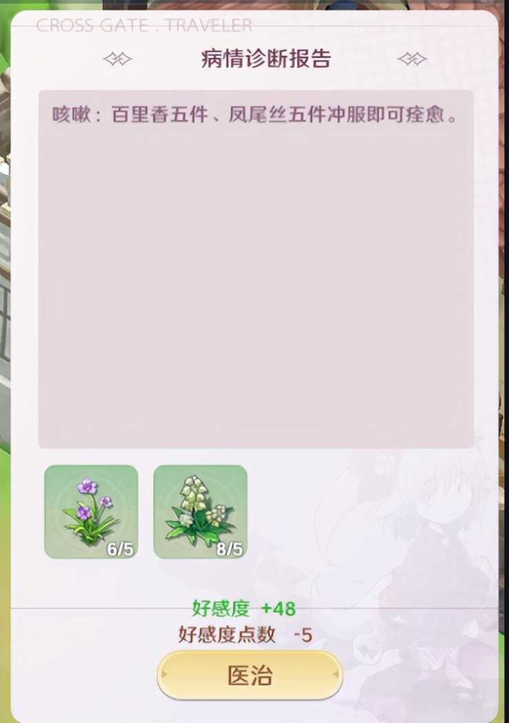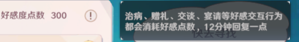 消耗:赠礼消耗5点好感度点数,医治消耗5点好感度点数,交谈消耗10点好感度点数,宴请消耗10点好感度点数。