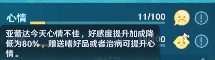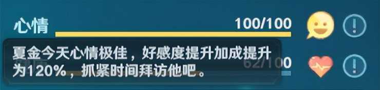 在每天5点时候,会随机刷新当日NPC的心情,心情最大值为100,最小值为1(不太确定,因为没有注意过是否有0的情况)。心情在某一区间段时,会影响我们获得好感度的数值。