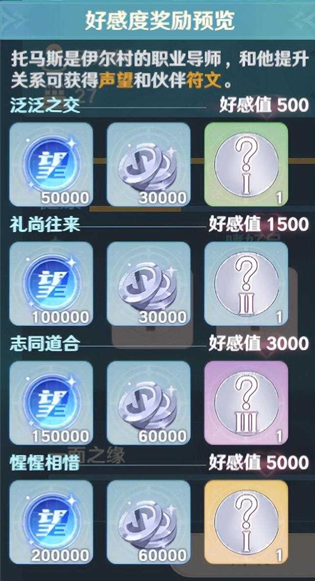 3、伙伴符文奖励:显示标识为战斗导师的NPC在提升好感度阶段时,会赠与玩家与NPC职业相对应的不同品质的符文,即战斧导师只会赠送战斧伙伴的符文,不会赠送传教士伙伴的符文,在想获得对应符文的时候需要注意一下,不要选错对象。