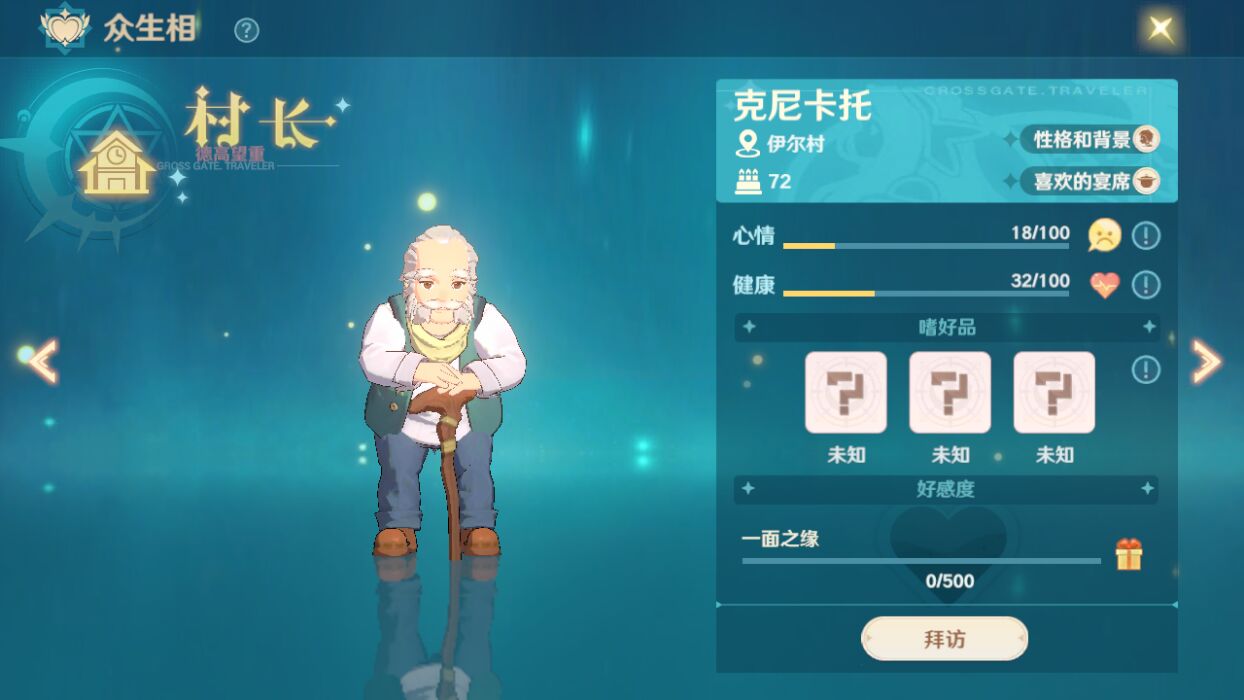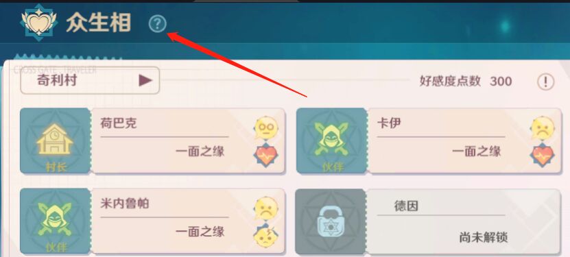 功能开启后,众生相的头像都是灰色的,是处于未解锁状态的,我们首先要做的是找到对应的NPC,和其对话,解锁和该NPC的好感度,用通俗的话说就是:先刷个脸熟。