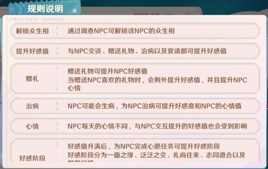 1)物品的基础好感度:顾名思义,每个可以赠送的物品都有一个基础的好感度,等级越高的物品基础好感度越高,就像我们送同一个NPC,送6级材料获得好感度是大于送1级材料获得的好感度的。