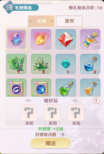 在这个界面我们可以选择任意一个道具,进行赠送操作,当我们选择物品后,下方会显示赠送该物品可以获得好感度,如果我们曾经赠送过该NPC喜好的物品的话,则会在物品左上角显示一个爱心标识,同时也可以进入【喜欢】页卡中直接找寻同类物品进行赠送。