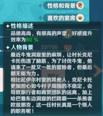 可以看到NPC的性格描述中有一个好感度提升效率为XX%,这个就是影响我们刷好感度快慢的最重要的因素了,因为这个值对于某一个NPC来说是不变的,而且每个NPC之间的好感度提升效率差别还是很大的,像方涅尔的好感度提升效率只有60%,而亚蕾达的好感度提升效率有140%之高。在后期可以做高等级的宴请后,2天就可以刷满一个好感度提升效率为140%的NPC,而在同等情况下,好感度提升效率为60%的可能就需要5天。