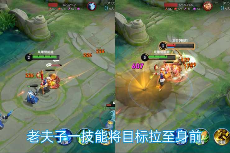 老夫子的被动除了强化自身攻速与移速之外,还拥有另外一个被动效果,那就是强化期间普攻会携带真伤,并且每次普攻都能减少一二技能的冷却时间,而老夫子也是凭借该被动来实现高免伤。老夫子的一技能可以将敌方英雄拉至身前,随后还会对命中目标造成减速效果,从而可以与敌方英雄近战肉搏。该技能通常被用来抢线,可以将路径上正常对线的敌方兵线全部拉至身前,然后通过普攻范围伤害快速清理,当然该技能也常被玩家用来追击逃跑的敌方英雄。