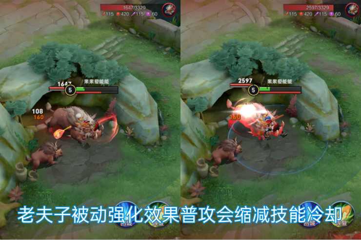 老夫子的被动效果是通过普攻来积攒能量条,当能量条叠满之后就会进入一个类似于“狂暴”的状态,被动触发期间老夫子会获得近乎全面的加成,期间移动速度与攻击速度都会被大幅度提升。该被动效果时常被玩家们用在对线之前,老夫子会通过敌方小兵或者野怪来叠加自身的被动,从而可以更快地在对线时直接激发被动效果。这里建议玩家们前期使用老夫子对线时,先通过河道中的河蟹叠加被动,然后再上线与敌方玩家近战肉搏,这样就能快速地打出优势。