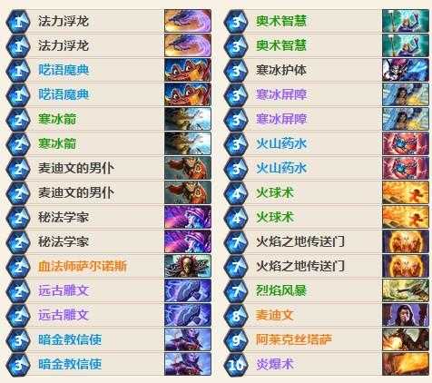 呓语魔典:因为这套卡组偏前中期,所以适当投入低费随从十分重要。这张卡充满了随机性,它给你的法术总是能在关键的时候发挥作用。毕竟整套卡组曲线平滑,解牌也很多,所以你也不用太指望魔典总能给你最合适的法术。当然了,大部分时候你打出它的时候总会怀揣梦想,祈祷它能给你带来一些斩杀或者AoE。法师职业的法术质量都很不错,所以也不用太担心。 法力浮龙:所有节奏法必带的随从。以前它总是和火妖、奥数飞弹、奥数冲击一起出现,但现在它更多的是与奥秘和低费法术配合;甚至配合英雄技能去解场。在对阵快攻卡组时,你的对手基本都会用随从把法力龙换掉,或者用一些直伤来解它,自带嘲讽属性;在打一些慢速的对手时,如果你能养大法力龙并将其保护好,你甚至可以早早的把对手踢死。更值得一提的是,法力浮龙的3点生命值可以让它在沐浴过火山药水之后屹立不倒,留给对手一个不得不处理的1血随从。 远古雕文:十分超模的法术。正如上文中提到的,法师职业的法术都非常优质:高伤害直伤卡,各类变形术,强力的AoE等。发现一张法术已经很不错了,更赚的是其费用会减少2费。你完全可以留着你发现的法术,找机会配合血法或者麦迪文。如果你运气特别好的话,还可以打出法力浮龙/鸡腿杖+远古雕文+远古雕文+远古雕文… 秘法学家:科学家的继承人,相比之下多了一点生命值。法师对费用的完全利用十分重要,而在游戏的后期当你需要抽到或打出一些关键法术时,你鬼抽了一张奥秘,这就十分尴尬了。秘法学家的价值就在于此:她在压缩你卡组的同时让你给了你自由选择挂奥秘的时机。就算她之前没有帮你把冰箱拿上手,她也变相提高了你在游戏后期抽到冰箱保命的几率。在前几回合,2费2/3的身材也说的过去。总的来说,这个随从非常值得满编。