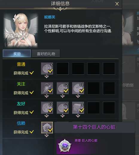 难度太高,需要10w+好感度点数,不建议在游戏前期强行拉好感度,因为不用她的这颗,已经非常容易凑12个巨人之心去换完技能点;