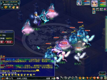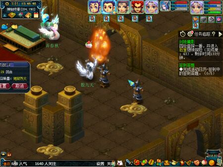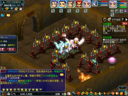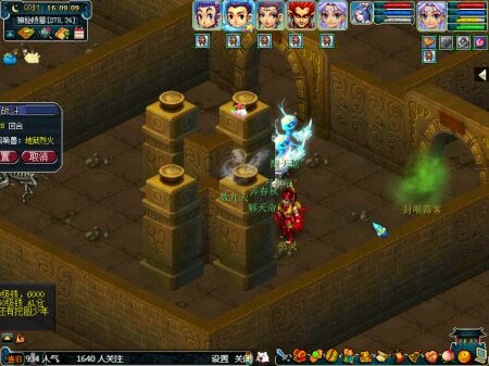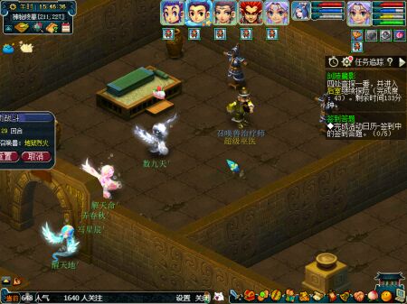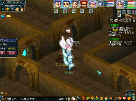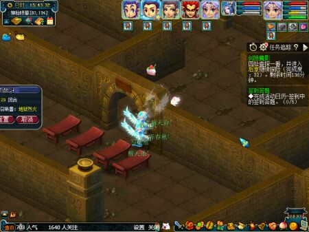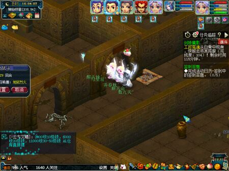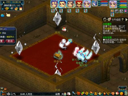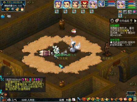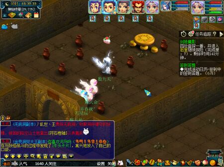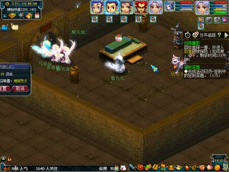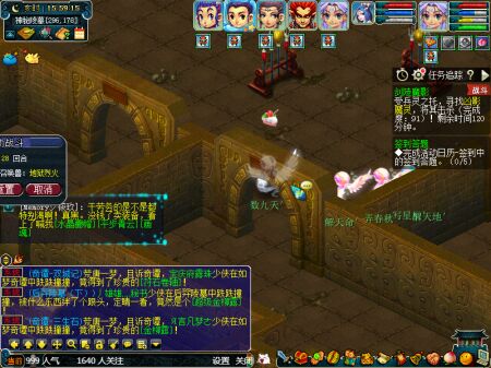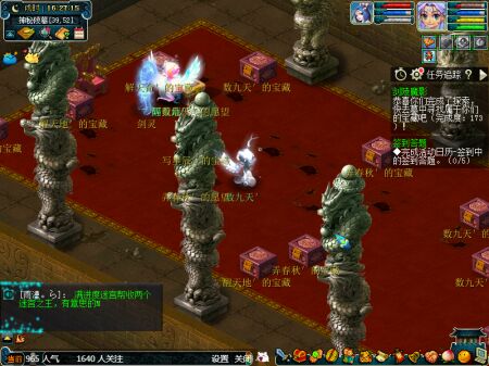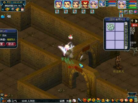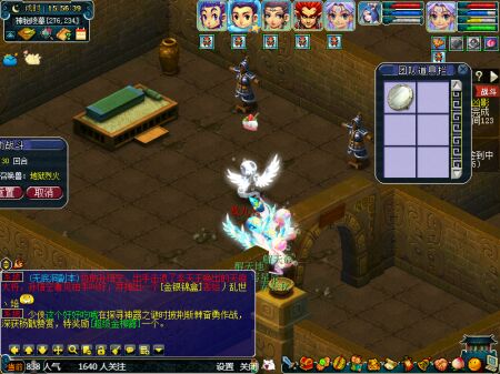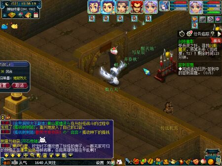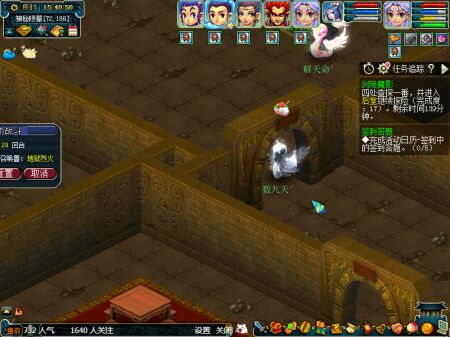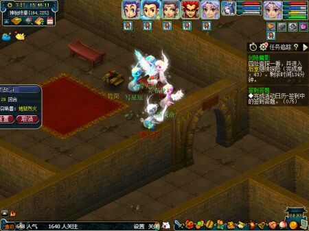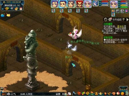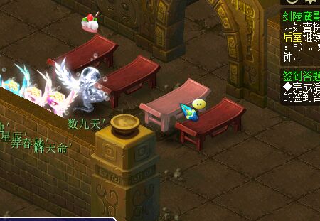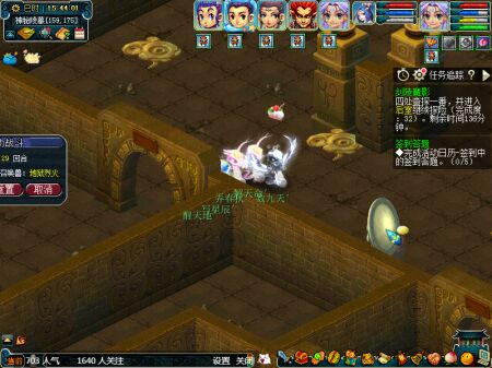 然后我们贴着墙从左向右走,或者从右向左走也可以,这个随意。个场景属于答题位置,可以散队答题,获得完成度,这个位置有可能会获得如意丹、宝图等。