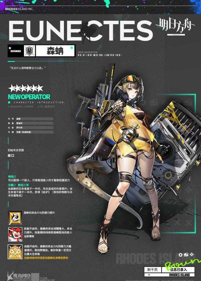 综合来说,笔者认为森蚺是披着重装职业标的近卫干员,并且预测森蚺的费用应该大于30。其二技能十分值得期待,长硬控谁不爱呢?