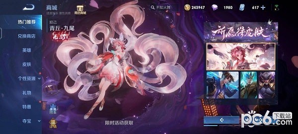 4、通过好运符998或者九尾如意令2个,可以在兑换商店直接兑换获得该皮肤,仅限2023年6月7日23:59前兑换;