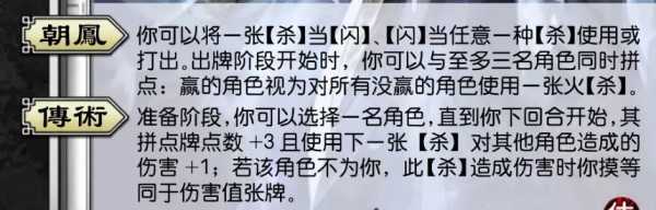1、准备阶段,你可以选择一名角色,直到你下回合开始,其拼点牌点数+3且使用下一张【杀】对其他角色造成的伤害+1;