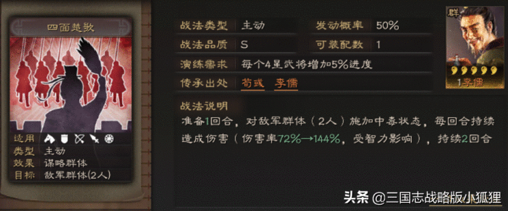 1. 降低敌方60%武力,这个战法相当克制菜刀队。