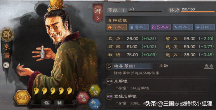 另外:小狐狸个人觉得在战法上面,李儒应该跟贾诩的战法换一下。小狐狸看过很多三国小说,都是把贾诩安在了毒士的位置上,刚好贾诩的战法是混乱效果,李儒跟着董卓一起混乱朝堂也算说得过去。