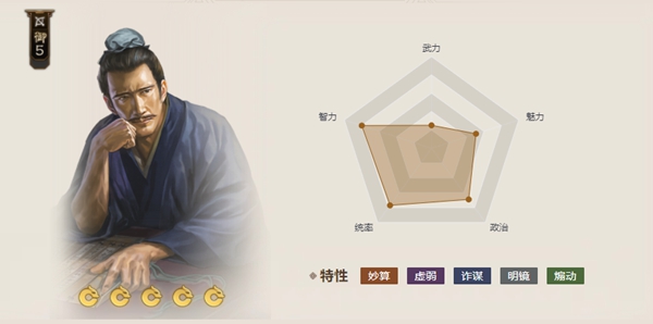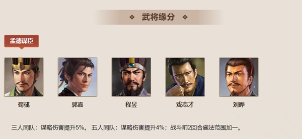 三人同队:谋略伤害提升5%。 五人同队:谋略伤害提升4%;战斗前2回合施法范围加一。