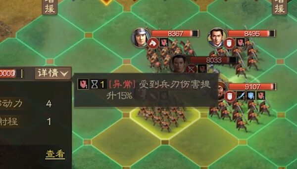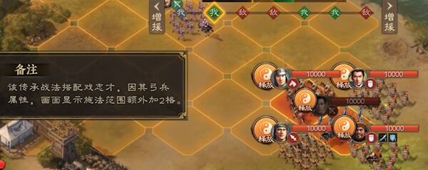 主动型战法,无冷却回合,释法范围为周身圆形范围2格,影响目标周围圆形1格。