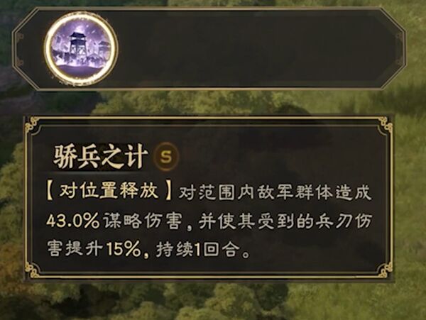 对范围内敌军群体造成43%~86%谋略伤害,并使其受到的兵刃伤害提升15%,可叠加,持续1回合。