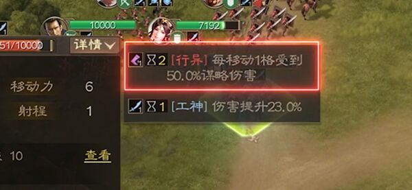 释放后对敌方单体造成谋略伤害并附带行异效果,移动会受到额外谋略伤害。