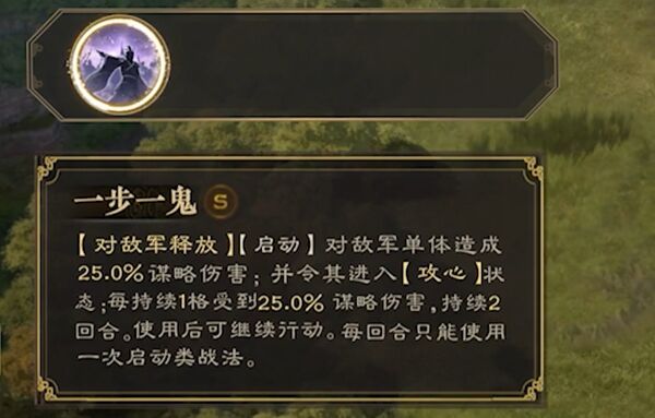 【启动】对敌军单体造成30%~60%谋略伤害;并令其进入【行异】状态:每移动1格受到30%~60%谋略伤害,持续2回合。