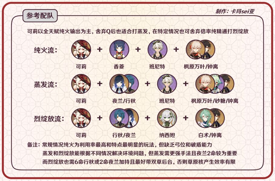 本篇根据各流派对可莉天赋的利用程度,分别介绍纯火流、蒸发流与烈绽放流。